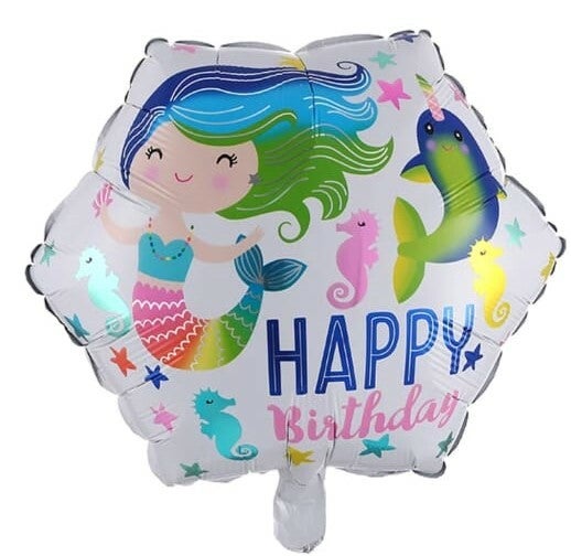 Deze leuke "Happy Birthday" ballon in zeshoekige vorm met een opdruk van een zeemeermin is een magische toevoeging aan het feestje! De ballon wordt geleverd met heliumvulling en heeft een grootte van ongeveer 45 centimeter. Omdat folieballonnen één tot meerdere weken blijven zweven, heeft de jarige er lang plezier van!